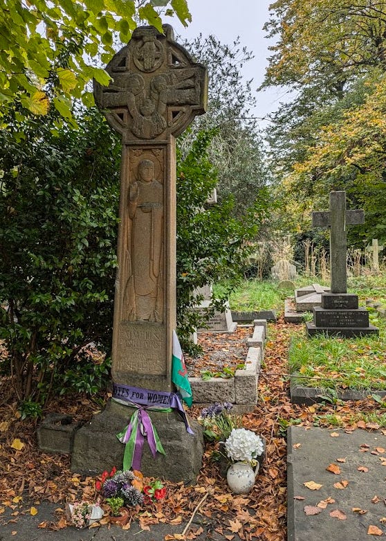 As we explored the cemetery further we discovered a wealth of local pilgrimage sites that included the resting place of Emiline Pankhurst, whose story I teach in my Feminist Political Ecology class at Goucher College. A newer statue in Manchester (the woman’s memorial installed in Manchester in a century!) has also become a local pilgrimage site, near the Pankhurst Centre, the former home of the Pankhurst family. Though Pankhurst is a globally important historical figure, the gravesite here melts into the beautiful natural setting of the rewilded cemetery, its Celtic cross rising tree-like within a setting that is part wildflower meadow and part woodland. Compared to the industrial setting of the newest tribute Pankhurst statue in Manchester, the gravesite is surrounded by renewed nature.